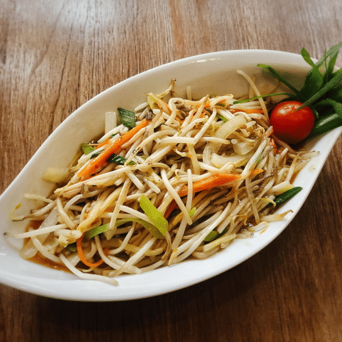 Het bestaat uit 3 gerechten: 1. kipballetjes met zoetzure saus 2. chopshoy met kip 3. kip met divers groenten.