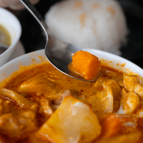 Dagsoep, gepaneerde kip (met saus), kip met groenten in curry saus en gebakken rijst.